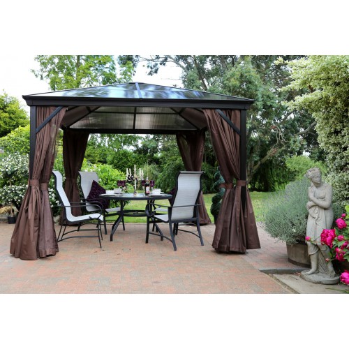Беседка без стенок может быть спасена за счет москитных плотных штор, которые не пропустят внутрь насекомых, ветер и палящие лучи солнца, что спасет отдых на природе.